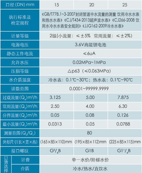 產品概述: 本產品符合GB/T778-2007《封閉滿管道中水流量的測量 飲用冷水水表和熱水水表》和《CJ/T434-2013超聲-波水表》標準。適用環境:戶內安裝、樓道管道井安裝。功能特點:●無機械運動部件,無磨損,使用壽命長;●始動流量低,滴水計量,量程比R=250;●可更換電池設計,無需從管道拆卸水表;●防護等級達到IP68,可長期浸水工作;●采用微功耗技術,電池供電可≥10年;●安裝多角度,管道壓力損失降到更低;●高度智能化的自檢能力,監測空管、氣泡、換能器老化、電池欠壓等常見問題; ●支持多種接口(M-Bus接口、RS-485接口、Rf射頻功能、物聯網)。